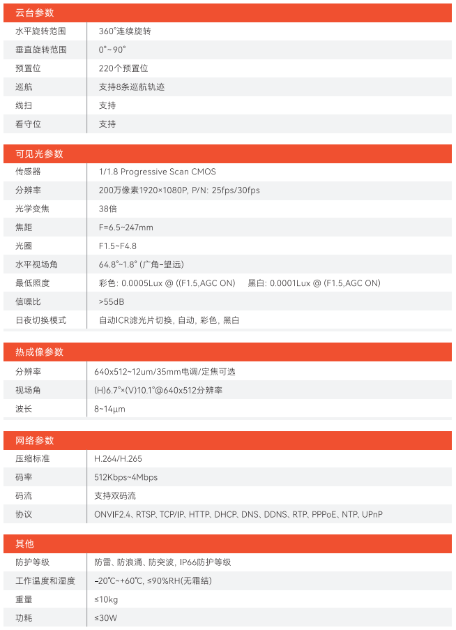 1、热成像+可见光 热成像分辨率640×512+35mm镜头 200万38倍长焦可见光 2、激光+可见光 800米变焦激光 200万38倍长焦可见光